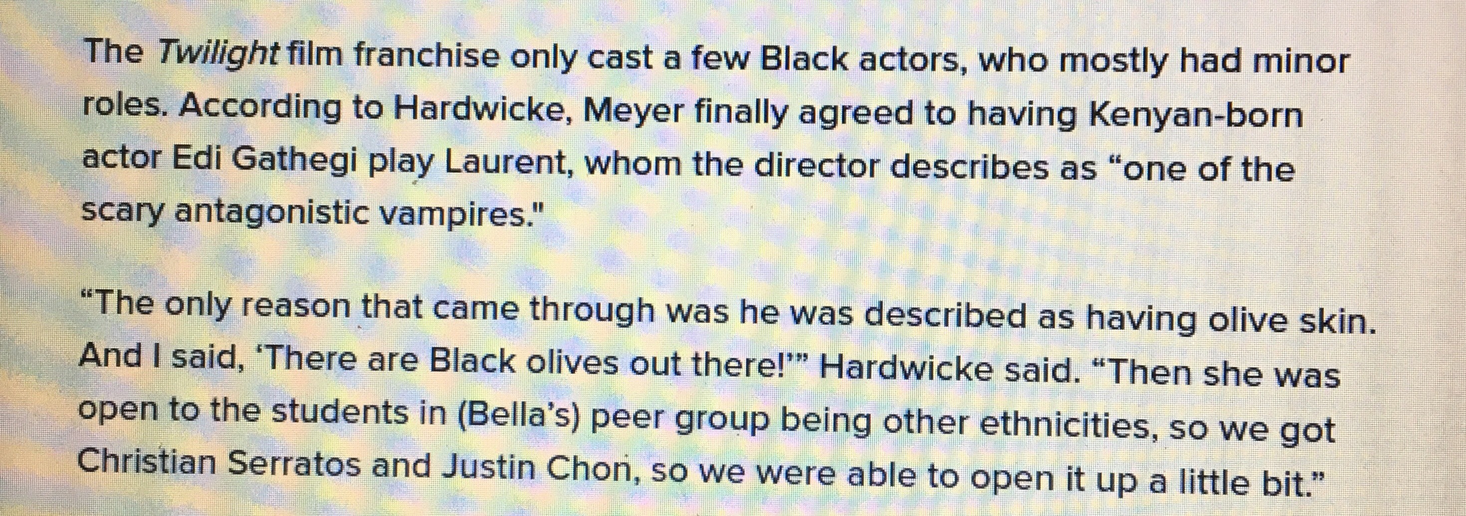 Now, reading those two paragraphs, after already reading that Meyer could not see any of the Cullens as anything other than white due to their “pale glistening skin” – notice that white was not included in that statement – the director had to resort to saying that “There are Black olives out there!” that made Meyer agree to the casting of Edi Gathegi as Laurent. Since Meyer herself described Laurent as having olive skin, that should count as diversity, right?