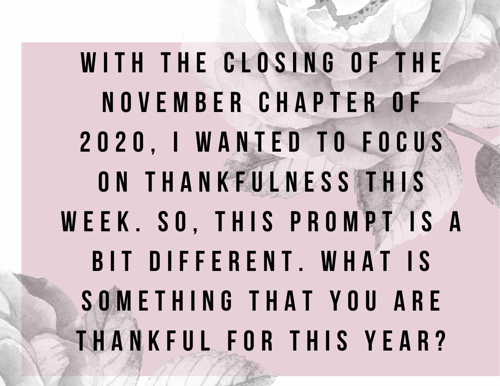 With the closing of the November chapter of 2020, I wanted to focus on thankfulness this week. So, this prompt is a bit different. What is something that you are thankful for this year?