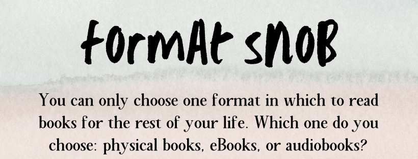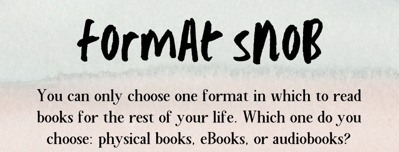 Yes, you! I’d love to see any of you do this tag. It was pretty fun! I never thought about what kind of book snob I would be, but I can definitely see me as an audiobook snob. Although I will say that if I don’t like the narrator I won’t listen to it. I already had one case of that come up with an indie audiobook I came across on hoopla. I’ll have to see if the library has the eBook version of it, if I’m able to finally be able to read it with the way I’ve been having issues with my eyesight.