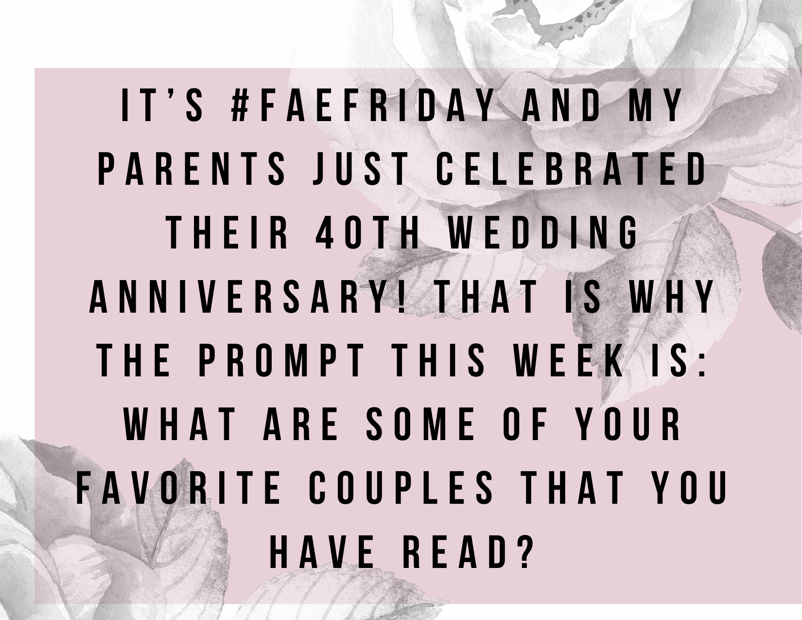 It’s #FaeFriday and my parents just celebrated their 40th wedding anniversary! That is why the prompt this week is: what are some of your favorite couples that you have read?