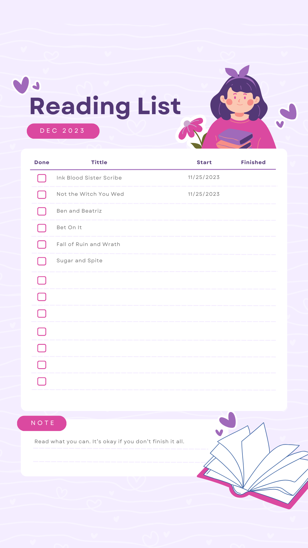 So I’m changing this section to a reading list, because I’m going to try to torture myself to stick to some sort of list! Maybe I’ll actually do this more in 2024, but I can try to start now, right? So let’s see what’s on my list, and see what I end up reading from it!